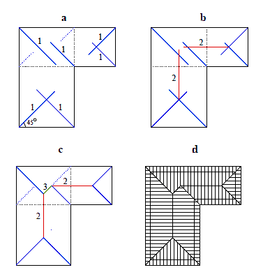 - Kesişen tepe noktaları düz çizgilerle uzatılarak ve diğer köşe açıortaylarıyla birleştirilerek tepe mahyası çizilir. (b)