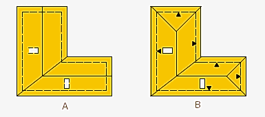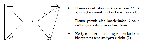 Çatı tanziminde uygulanacak yol, bina köşelerinin açı ortaylarını uzatarak kesişen noktaları birleştirmektir.