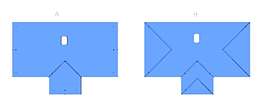 Farklı şekildeki bir çatı hem beşik, hem de kırma çatı şeklinde tanzim edilebilir. Yukarıdaki şekillerde aynı şekildeki binaların beşik ve kırma çatı modelinde tanzim edildiklerine dikkat ediniz.