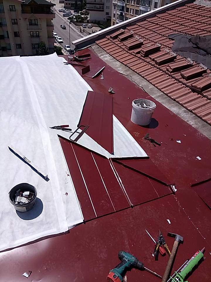 - Su Yalıtım Örtüsünün Değiştirilmesi: Eski su yalıtım örtüsü sökülerek yerine polyester keçeli kiremit altı örtüsü serilir ya da pürmüz yardımıyla membran yapıştırma uygulaması yapılır.